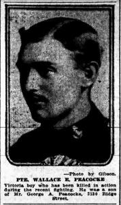 Wallace Elmore Peacock was born on Monday, 13 February 1893 at Victoria, British Columbia, Canada. He appeared in the household of George Augustus Peacock on the census of April 1901 at Toronto, York Co., Ontario, Canada. He is listed as: Peacock, Wallace, male, white, son, single, born 13 Feb. 1893 in B.C., age 8, of Irish origin, Methodist, attended school for 9 months, able to read, write and speak English. He appeared in the household of George Augustus Peacock on the census of April 1911 at 834 Victor Street, Victoria, British Columbia, Canada. He is listed as: Peacock, Wallace, male, son, single, born Feb. 1893 in B.C., of English origin, Canadian nationality, Congregationalist, working as a lather on houses, no earnings listed, able to read, write and speak English.